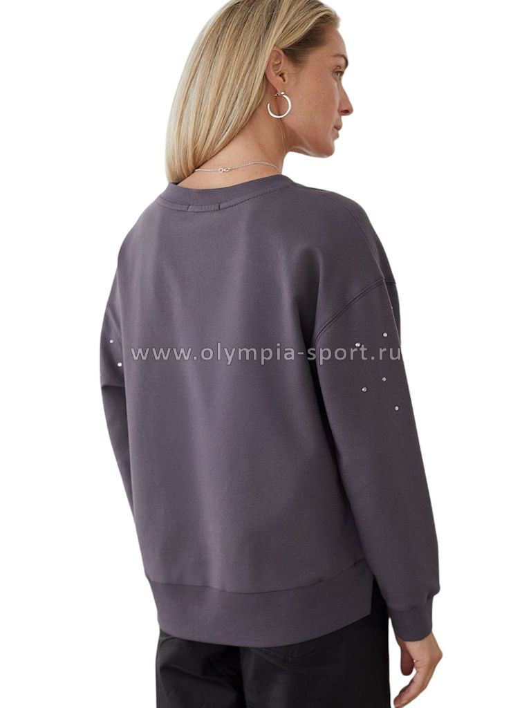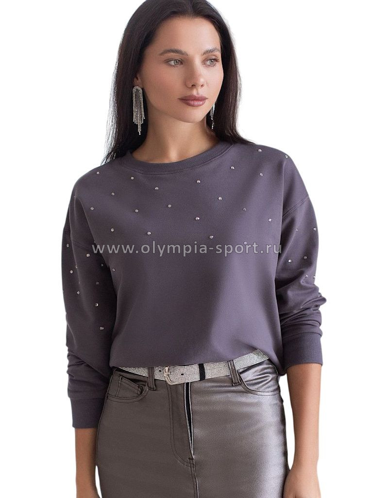 Свитшот выполнен из эластичного футера двухнитки. Изделие дополнили лаконичным принтом стразами в тон изделия. Расслабленный стиль поддерживает спущенная линия плеча, свободный силуэт и разрезы по бокам. Модель сочетается в костюме с брюками D44.135, D44.136, D44.137 и юбкой D46.034
