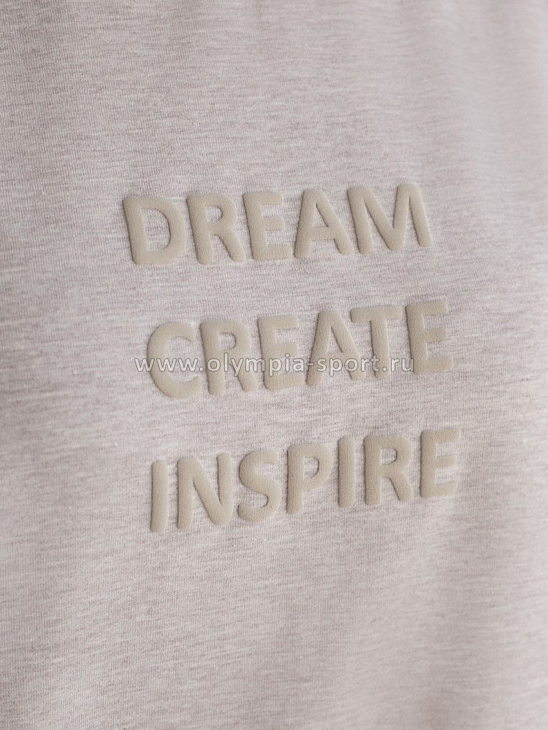 Перевод принта: Dream, create, inspire — мечтай, создавай, вдохновляй Футболка из премиального хлопка, высокое качество хлопковых волокон обеспечивает комфорт в любое время года. Горловина выполнена из рибаны в тон изделия, Рукава с подворотами и золотистым логотипом бренда. Авторский принт нанесен фактурными красками с устойчивым покрытием. За счет эластана в составе идеально держит форму и сохраняет внешний вид в течение долговременного использования. Универсальная вещь для ваших стилистических решений.